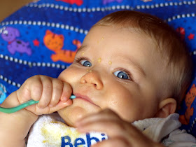 Całkiem własny, malutki i absorbujący. Fajnie się go maca małym tłustym paluchem. Tym samym, który potem pracowicie wciera we włoski rozmoczone chrupki kukurydziane.