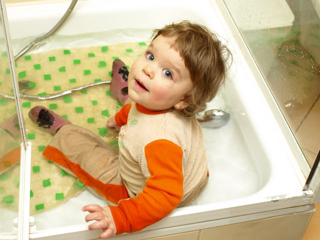 Nalewałam dziś dziewczynom wodę do brodzika. Nagle nastąpiła gwałtowna acz niespecjalnie brzemienna w skutki akcja zacięcia się Lilowego paluszka w drzwiach wahadłowych, więc wyskoczyłam z łazienki na odgłos kwików więzionej między skrzydłami biduli. Kiedy po wychuchaniu bolącego kciuka wróciłam do łazienki, okazało się, że Rózia już się kąpie...